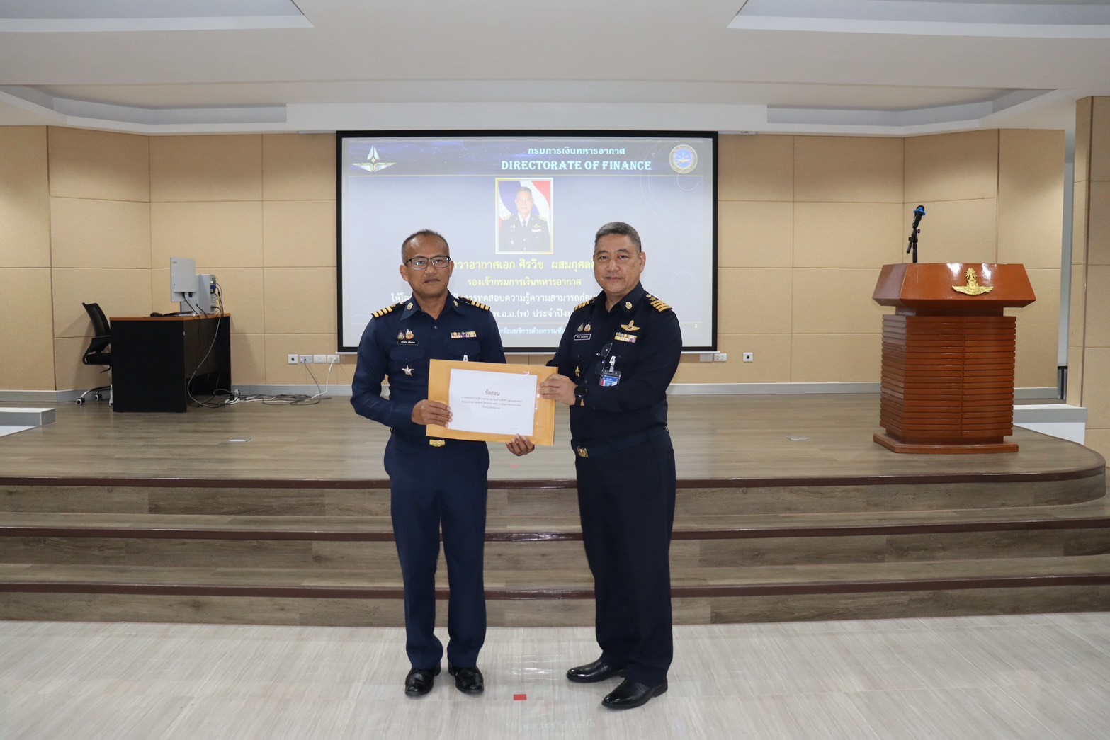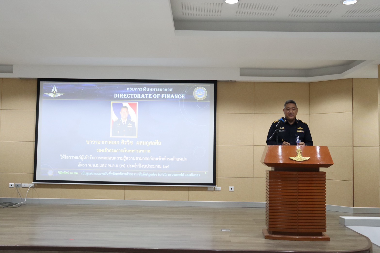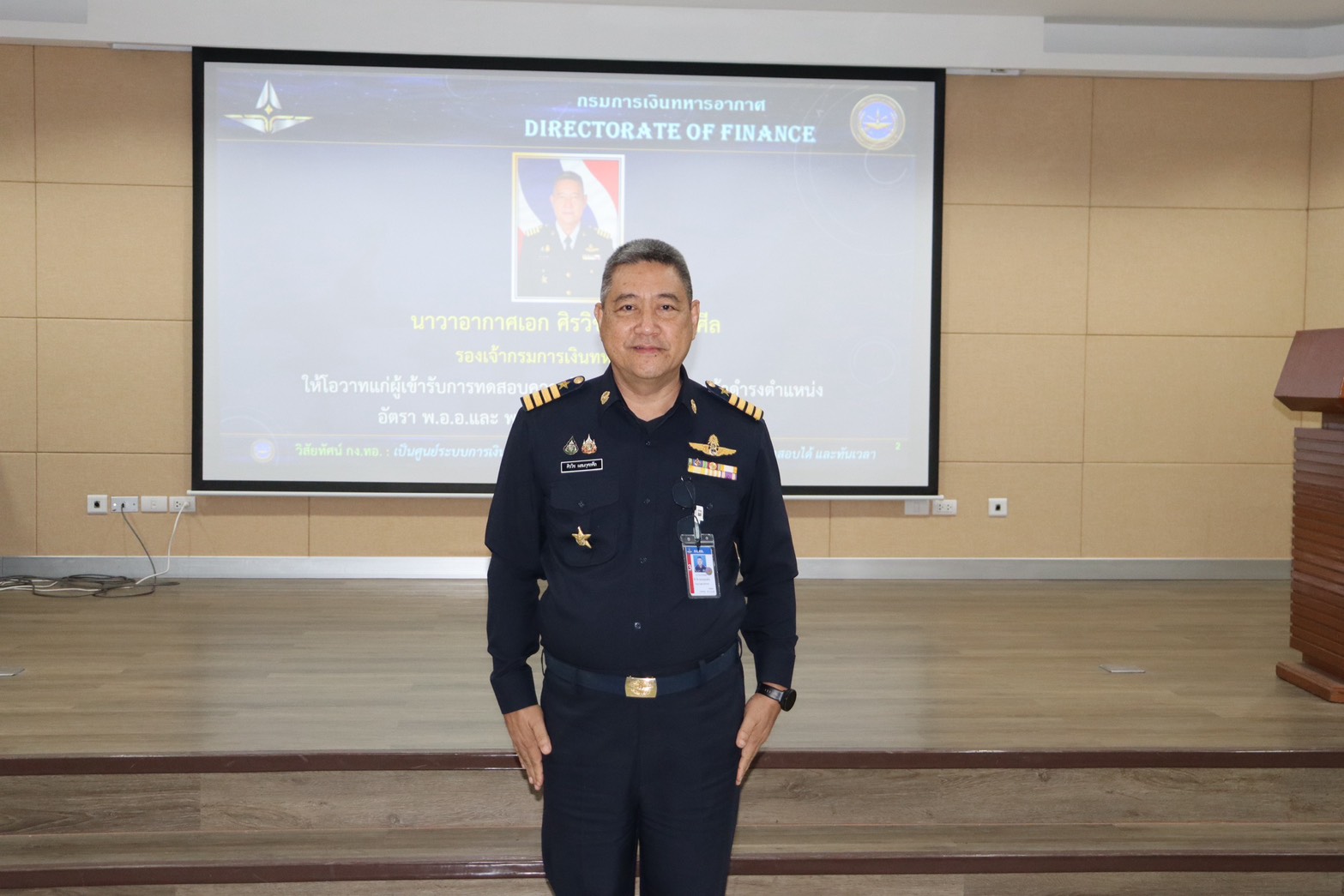 นาวาอากาศเอกศิรวิช ผสมกุศลศีล รองเจ้ากรมการเงินทหารอากาศ กล่าวให้โอวาทแก่ผู้เข้ารับการทดสอบความรู้ความสามารถก่อนเข้าดำรงตำแหน่งอัตรา พันจ่าอากาศเอกและพันจ่าอากาศเอกพิเศษ สายวิทยาการการเงิน ประจำปีงบประมาณ ๖๙ ณ ห้องบรรยาย โรงเรียนจ่าอากาศ กรมยุทธศึกษาทหารอากาศ เมื่อวันที่ ๑๒ ธันวาคม ๒๕๖๘